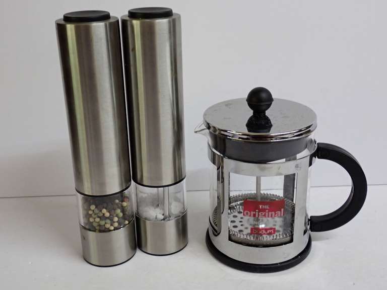 LOT 2142 - Bodum French Press and Stainless Steel Electric Salt and Pepper Grinders