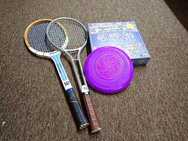 LOT 2136 - Dixit Journey Board Game, Frisbee, and Tennis Rackets