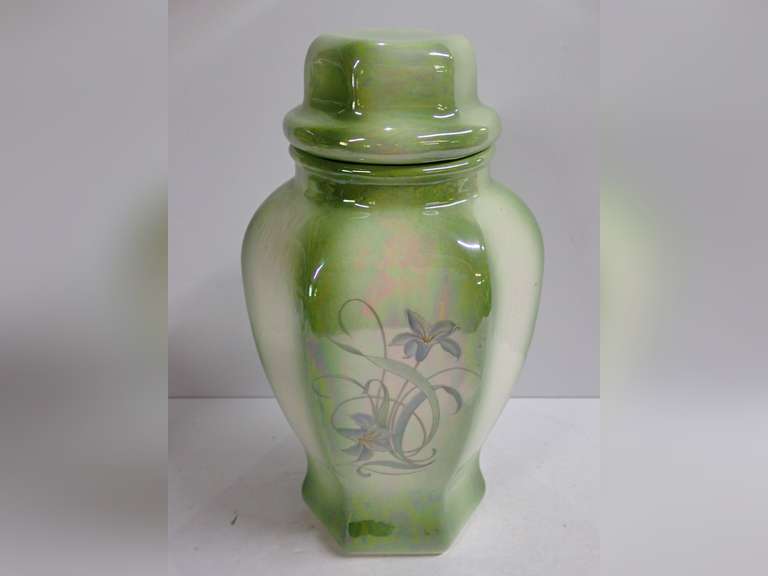 LOT 2049 - Green Lusterware Covered Vase with Marking