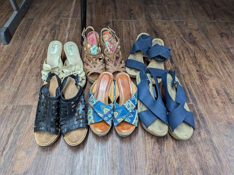 Collection of women's sandals in size 7. Lot includes brands like Born Concept, Sonoma Life and Style, and more. Various styles and colors are represented in this sandal assortment.