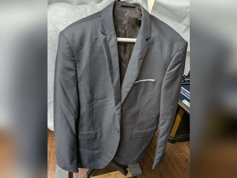 Gray men's suit jacket, size L. Features include interior lining and a pocket square.