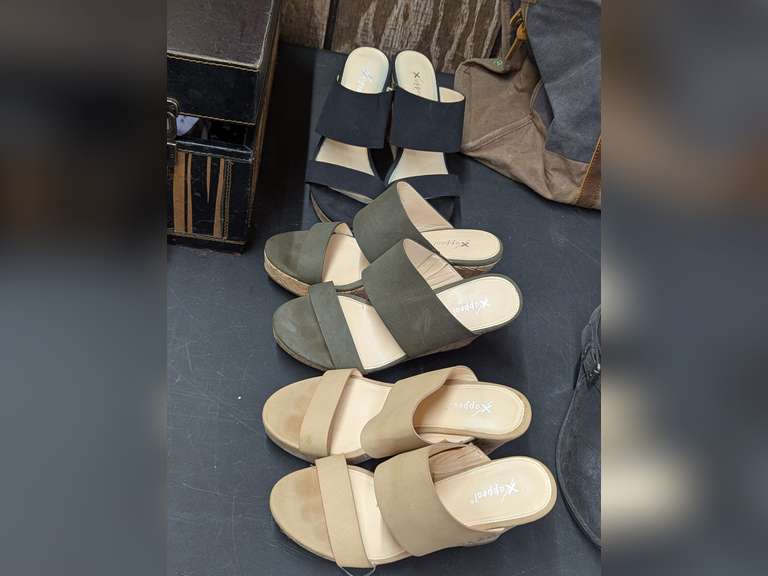 Three pairs of X Appeal brand wedge sandals. Includes one pair each in black, olive, and beige. Black and olive are size 8 and beige are size 7.5.