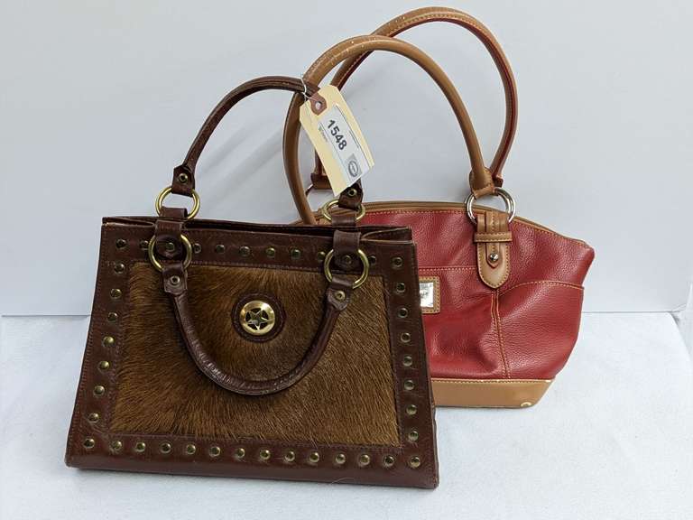 This lot includes two women's handbags. One is a Tignanello red leather purse. The other is a brown purse with genuine hide accents and studded details.