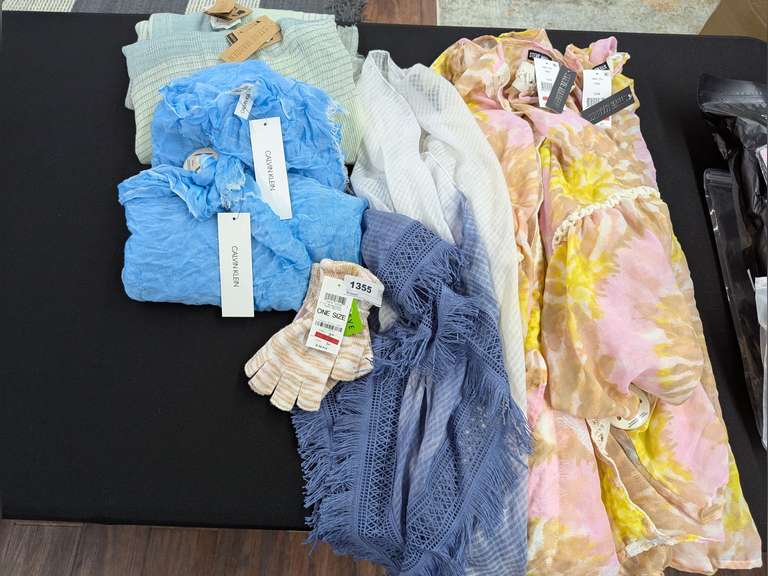 Collection of women's scarves, fingerless gloves, and a dress, featuring various colors and textures. The items have security tags attached.