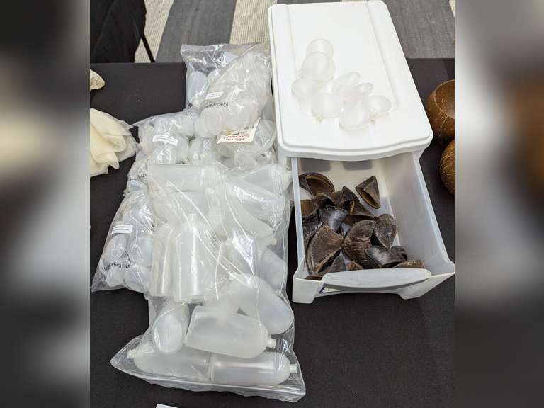 Large assortment of Downtown Pet Supply squeakers in various sizes and bags, plus a container of hooves. Great for dog toy making or repair.